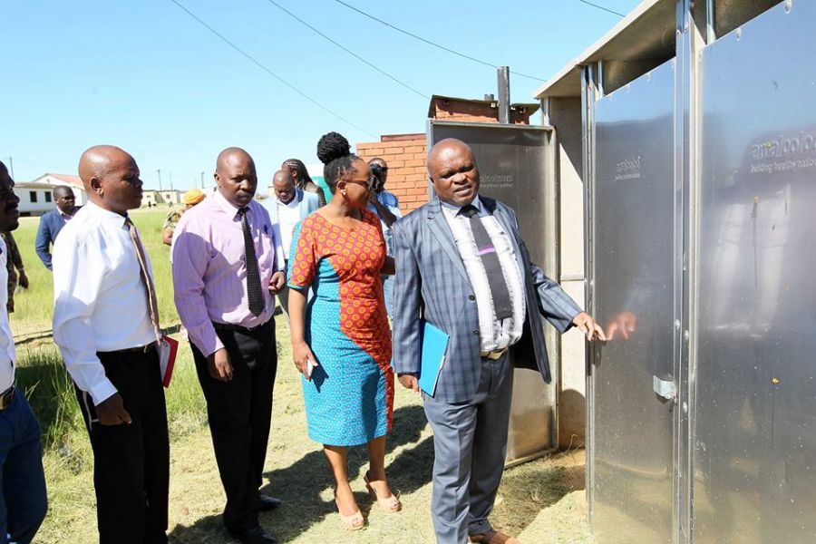 Photo 4 KZN MEC for Agriculture and Rural Development Mr Themba Mthembu together with KZN MPL Mr Jomo Sibiya, KZN MPL Mrs Ntombikayise Sibhidla-Saphetha and KZN MPL Mr Sizwe Mchunu accessing toilets during their oversight visit at Ekucabangeni Senior Secondary School as part of KZN Legislature School .